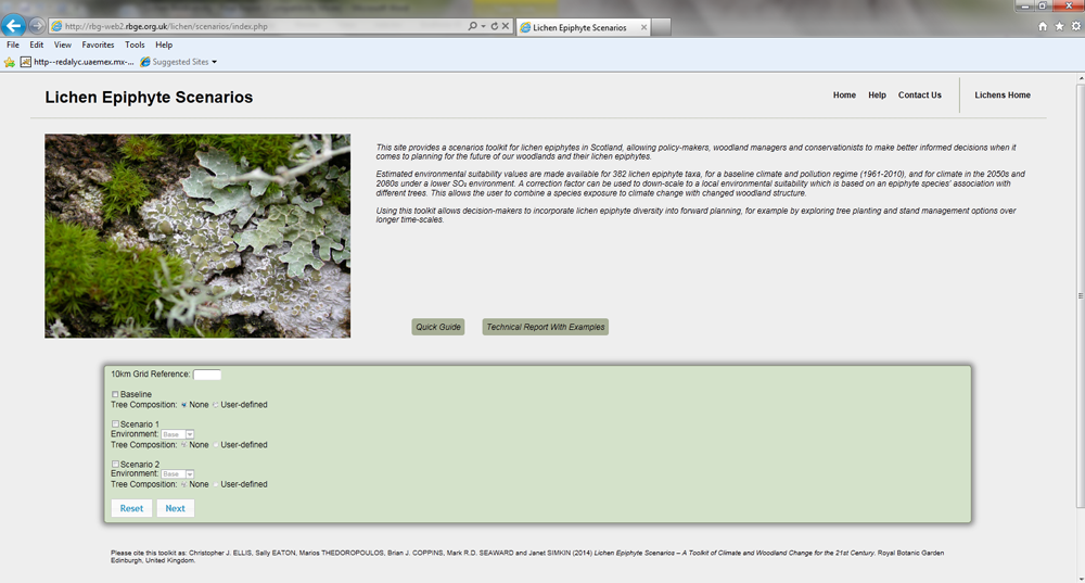 The Royal Botanic Garden Edinburgh and British Lichen Society have made available a toolkit in which lichenologists can explore the consequences of climate change at a site-scale, for 382 lichen epiphyte species. A value of ‘environmental suitability’ can be compared for individual species, or across an assemblage of epiphytes, between the present-day and the 2050s and 2080s based on Met Office climate models. This effect of climate change can be modified by woodland composition in order to account for stand-scale changes, such as might occur under a tree disease scenario. The toolkit is accompanied by a Quick Guide and Technical Report, and also features in the British Lichen Society Bulletin for Sumer 2014.